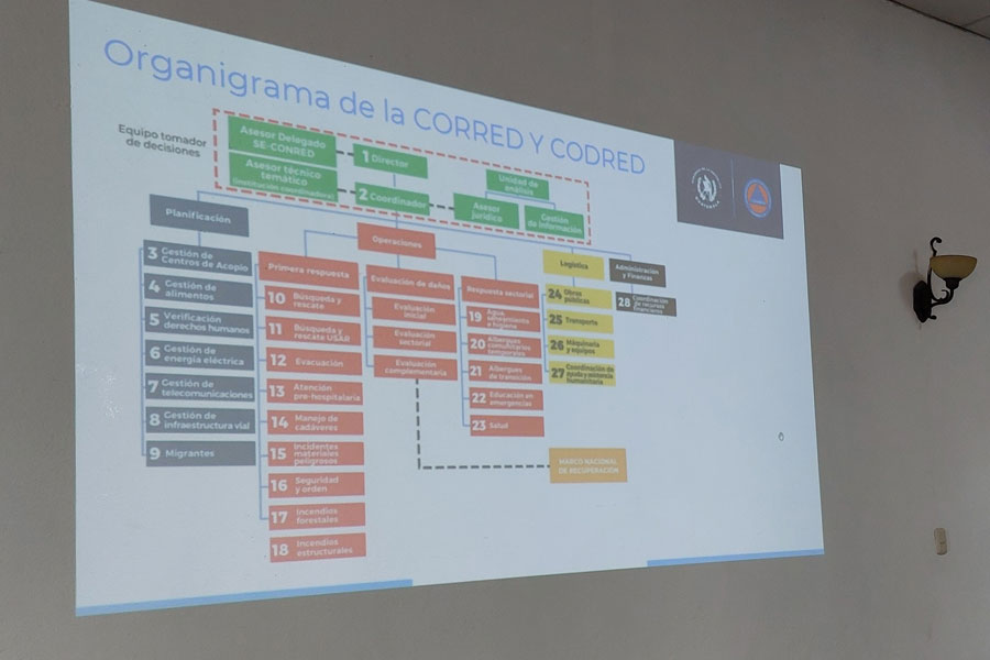La SE-CONRED estuvo a cargo de las presentaciones y los diferentes ejercicios que se realizaron y que forman parte de las responsabilidad del Centro de Operaciones de Emergencia que se activa en en caso de emergencias en el departamento.